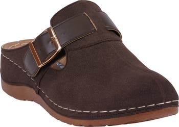 A buckled strap and contrast stitching elevates this comfort-cushioned clog lifted by a subtle platform sole.