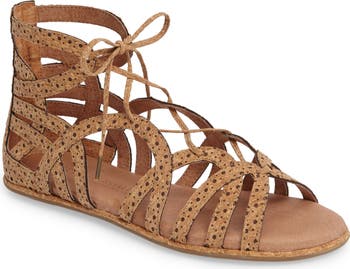 Curvy leather straps fashion a caged sandal with a lace-up front for an adjustable fit. A supersoft deerskin lining provides a supple feel, while a memory-foam footbed and a flaxseed-softened midsole cushion each step.