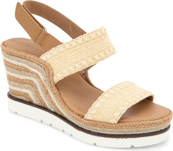 Raffia straps and a woven wedge heel keep things light and airy in this adjustable slingback sandal set on multilayer PORON® cushioning for premium comfort.