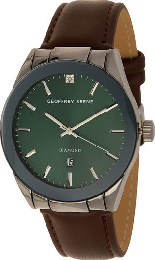 Show off polished style with this classic leather-strap watch featuring precise three-hand movement, a clear date window and a single diamond marker.