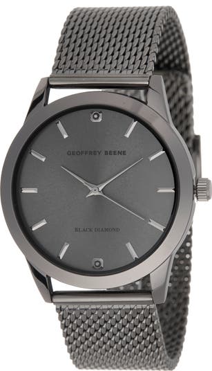 - - Gender: Men's - Case Material: Stainless steel/metal alloy - Dial Color: Gunmetal-tone with black diamond details (0.02 ctw) - Band Material: Metal alloy mesh - Closure: Mesh clasp - Case Diameter: 40mm - Band Width: 20mm - Band Length: 8" - Movement: Quartz - Box included - Imported Please note: Diamond weight may not be exact.