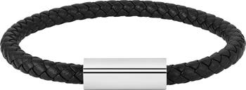 A smooth bar bead furthers the casual-cool styling of this woven-leather bracelet secured by a magnetic clasp.