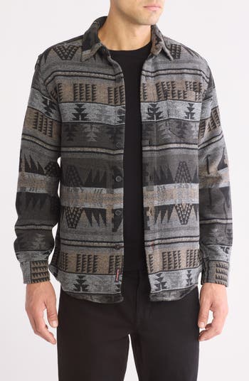 A bold geometric print brings Southwestern style to a brushed jacquard shirt-jacket constructed with a chest pocket and curved hem.