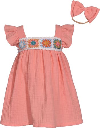 Crochet trim stands out on the front of this flutter-sleeve dress paired with a bow-topped headband.