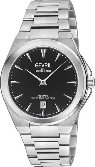 A polished bracelet strap elevates this water-resistant watch featuring precise two-hand movement, minimalist dash indexes and a clear date window.