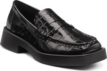 A square moc toe and sleek croc-embossed leather update the look of this classic penny loafer.
