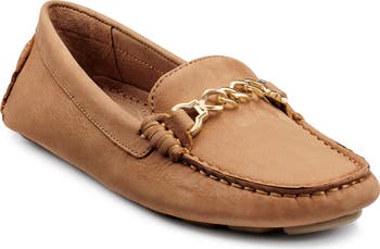 Rich goldtone links detail the top of a nubuck leather loafer featuring a grippy driver tread that climbs up the heel.