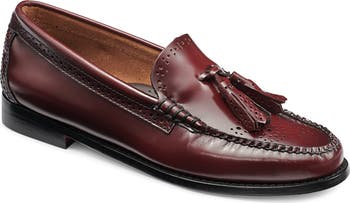 Playful brogueing trims the silhouette and spills onto the tassels of this moc-toe leather loafer with a cushy footbed and low stacked heel.