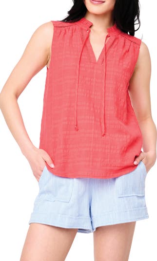 A split neck with ties can be shaped in a bow or worn undone in this versatile tank cut from gauzy cotton with ladder cutouts.