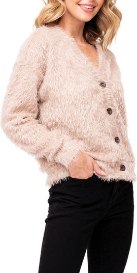 Warm up your cool-weather look with this sweet cardigan made from a feathery soft eyelash yarn and marbled buttons.