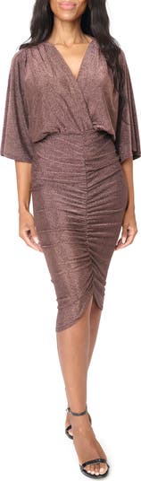 Twinkling metallic shimmer washes over this surplice-neck dress designed with elbow-length sleeves and ruched skirt.