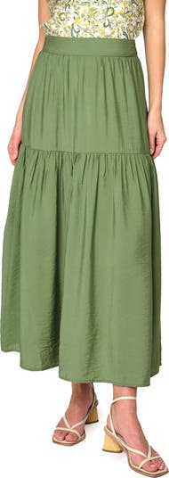 Graphic blooms lend instant impact to a summery skirt designed in a tastefully tiered silhouette.