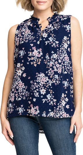 Winsome flowers adorn an airy sleeveless top cut from Swiss-dot chiffon framed by dainty ruffles and a flowy high-low hem.