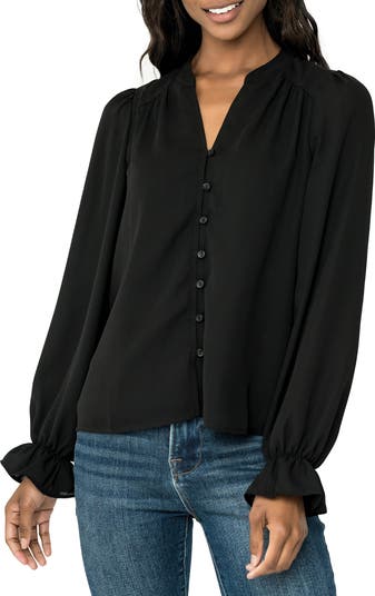 This picture-of-polish blouse is designed with puffed shoulders and flouncy ruffled cuffs.