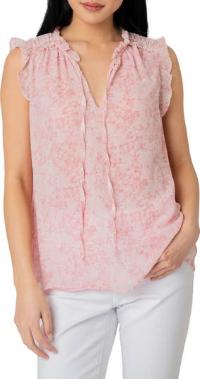Charm from day to night in this sleeveless chiffon blouse designed with soft ruffles and slender neck ties.