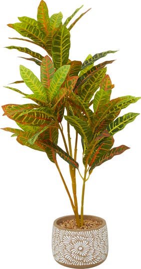 Green Faux Foliage Crotons Artificial Plant with Floral Patterned Pot