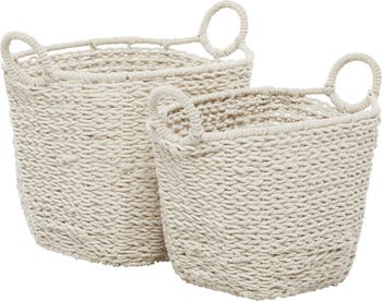Offer any bohemian themed home a final touch by displaying this decorative basket set that can hold throws, pillows, magazine or plants. Keep your space tidy and neat with the help of these storage baskets. Place them by your bedside, laundry room or living room to keep your space free of clutter. This item comes shipped in one carton. The materials are woven together to form oval baskets with side handles. Suitable for indoor use only. Made in India. This set comes with 2 baskets. Bohemian Theme.