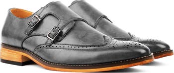 A brogue wingtip toe complements the smooth faux-leather of this monk strap shoe that's sure to add professional polish to any ensemble.