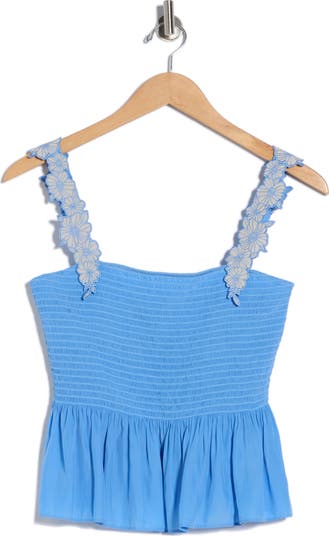 Embroidered floral straps bring a charming touch to this smocked top finished with a fluttering peplum.