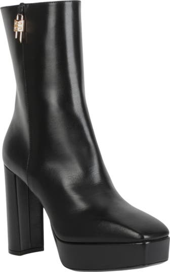 An ankle-high boot is timeless in smooth, polished leather with a platform toe and sky-high, covered heel. A 4G lock adds signature Givenchy panache to the standout look.