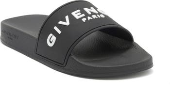 A dimensional Givenchy logo stands out on the wide strap of a laid-back slide sandal grounded with a star-studded sole.