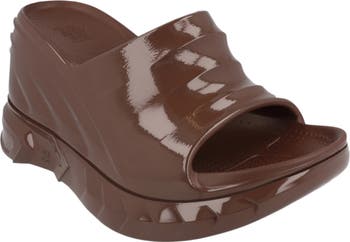 Set on a carved athletics-inspired sole with a grippy tread and logo detailing, this glossy sandal is taken up yet another notch with a thick wedge heel.