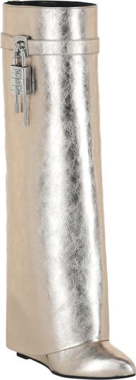 Bring instant swagger to your wardrobe with this knee-high wedge boot made from metallic leather with an overlaid shaft accented by padlock hardware.