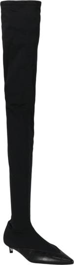 A kitten heel adds a practical finish to a striking eel-skin leather boot with a thigh-high shaft, expertly crafted in Italy.