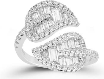 Round- and baguette-cut cubic zirconia stones compose this adjustable leaf bypass ring in the plating of your choice.