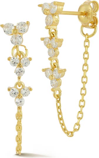 A trio of cubic zirconia clusters cascades down these dainty front‑to‑back earrings linked by a delicate chain.