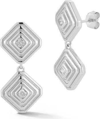 Sparkling cubic zirconia sit between two ribbed, diamond-shaped studs forming an eye-catching drop to adorn your lobes.