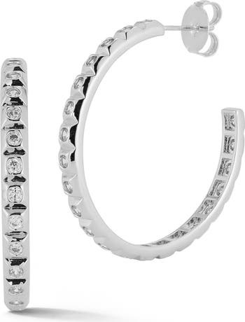 Bezel-set round cubic zirconia sparkle from these textured hoop earrings that bring dramatic shine to your looks.