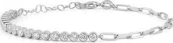 Bezel-set cubic zirconia trace half of this elegant paper-clip chain bracelet crafted from sterling silver with a polished rhodium or 14-karat gold finish.