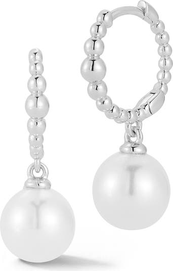 Cultured pearl drops shine from these bead-textured huggie-hoop earrings crafted from sterling silver and plated in polished rhodium or 14-karat gold.