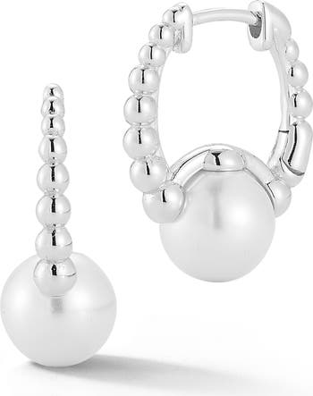 Lustrous cultured pearls enrich these bead-textured huggie-hoop earrings crafted from sterling silver and plated in polished rhodium or warm 14-karat gold.