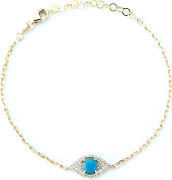 This dainty chain bracelet is centered with an evil-eye charm that's shimmering with a turquoise bead and cubic zirconia.