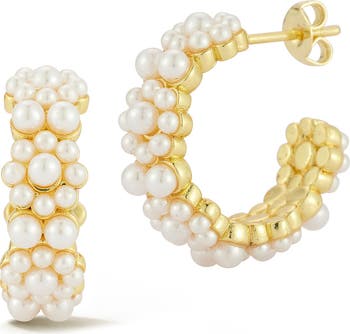Milky faux pearls adorn these elegant hoop earrings adding luminous shine to any look.