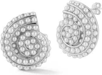 Bring a hint of seaside sparkle to your look with these shell-shaped stud earrings covered in faux pearls and dipped in a gleaming finish.