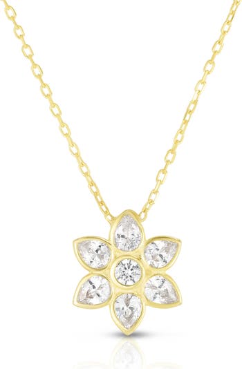 Teardrop- and round-cut cubic zirconia stones compose a dainty flower pendant strung on a chain necklace.