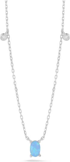 A dainty synthetic blue opal centers this chain necklace finished with bezel-set cubic zirconia charms for a hint of sparkle.