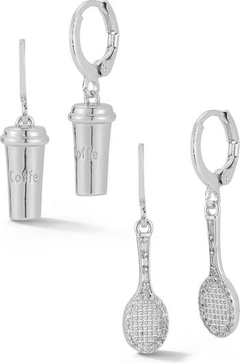 Set of 2 Coffe & Tennis Drop Huggie Hoop Earrings
