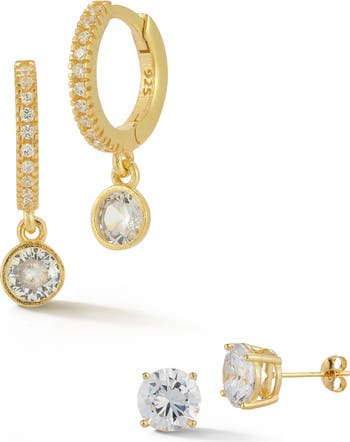 Bright-white cubic zirconia stones embolden the shine of an earrings set that pair classic, rounded studs with elegant drop hoops.