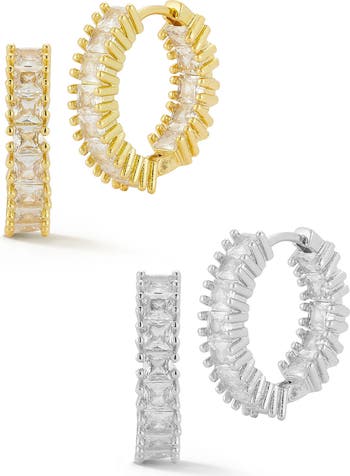 Upgrade your earring rotation with set of goldtone and silvertone hoops sparkling with shimmering prong-set cubic zirconia.