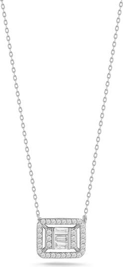 Cubic zirconia stones add shimmer to an elegant cutout pendant at the center of this dazzling sterling silver necklace.