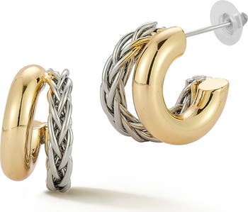 Add a striking element to your look with these two-tone earrings featuring both smooth and braided hoops.