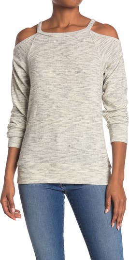 A classic sweatshirt features a modern twist with cold shoulder sleeves for an eye-catching look.