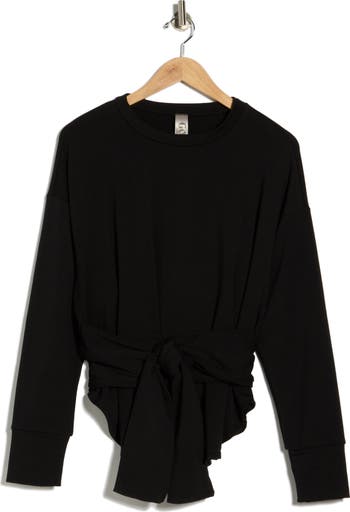 Cut from soft knit, this sweater features a tie belt at the waist for a faux-wrap look.