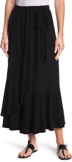 A midi skirt with a mock-wrap silhouette features a ruffled trim that elegantly flows off your figure.
