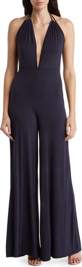 A low dipping V-neckline adds alluring appeal to this halter-style jumpsuit topped with adjustable tie spaghetti straps.