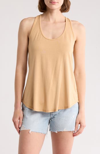 A curved hem distinguishes this easy-wear tank fashioned in a racerback silhouette for a sporty flourish to your warm-weather look.
